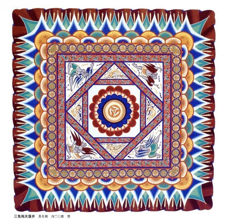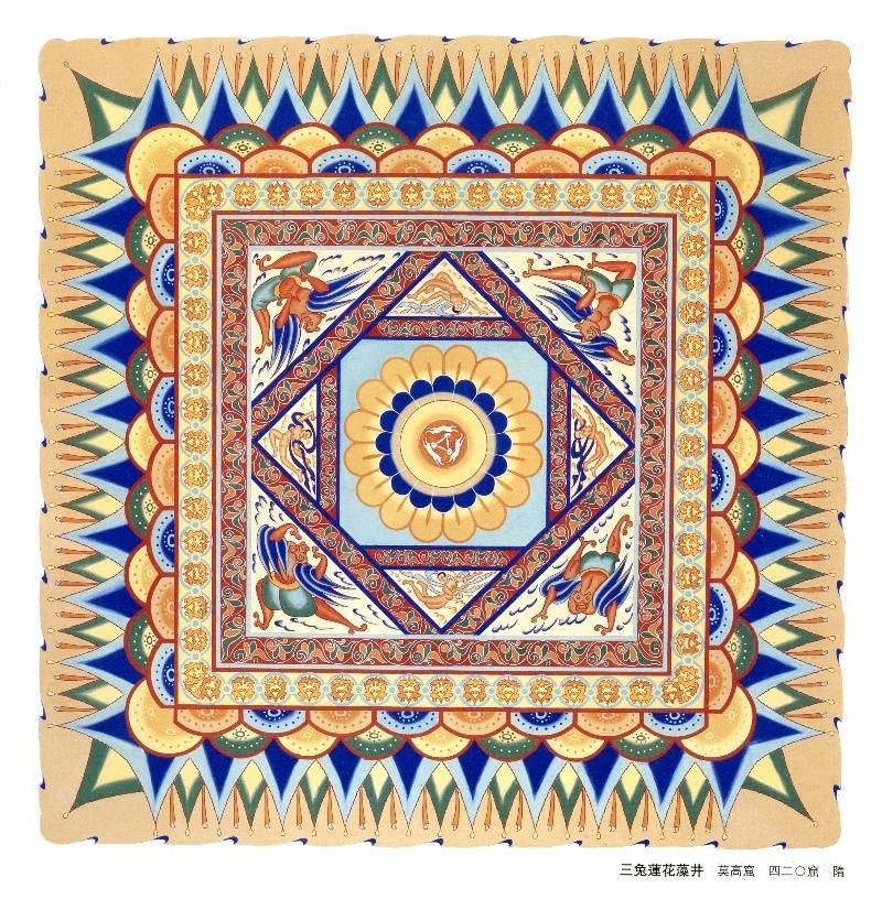 r三兔共耳图案、成熟的飞天造型、精美的纹饰图案相互映衬,共同构成了这幅令人叹为观止的藻井壁画,受到人们的广泛关注和喜爱。