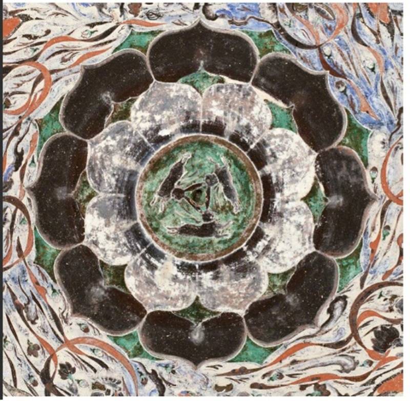 r踏入窟内,仰头凝望,藻井中央那朵八瓣莲花宛如夜空中绽放的星辰,花瓣层层叠叠,细腻而生动。莲花中央,是独具匠心的三兔连耳图案。