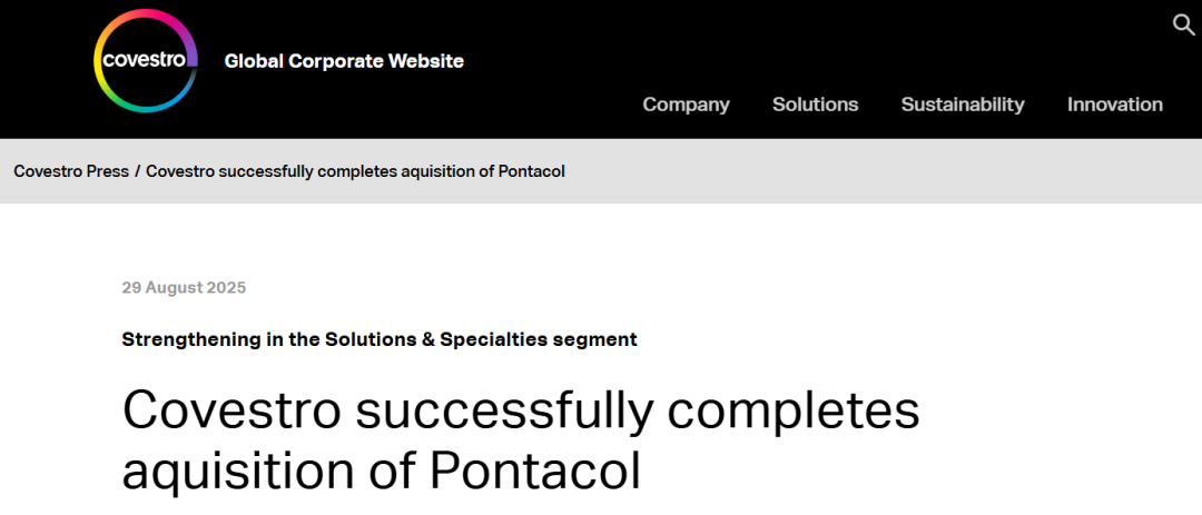 8月29日,科思创官网宣布已成功完成对瑞士多层胶膜制造商Pontacol的收购,该收购于2025年8月28日生效。该公司已于2025年6月宣布了该协议。双方均同意不披露收购价格。此次融资将通过现金方式进行,因此符合科思创(Covestro)保持稳健投资级评级的目标。