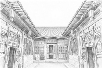 山西晋中平遥古城中国票号博物馆日昇昌旧址。AI修饰生成素描画